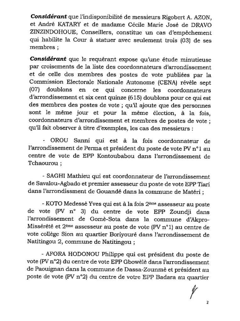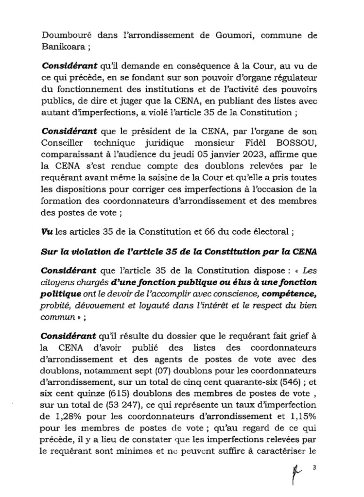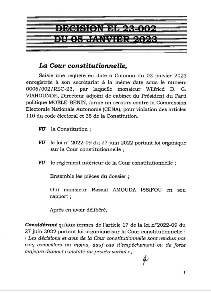 La Cour constitutionnelle a examiné en urgence hier jeudi 05 janvier 2023, le recours du Mouvement des Élites Engagées pour l’Émancipation du Bénin (Moele-Bénin) contre la liste des Coordonnateurs d’arrondissement (CA) et des Membres de postes de vote (MPV) retenus pour les élections législatives du 08 janvier. Dans sa décision EL 23-002 du 05 janvier 2023, la cour constitutionnelle a une fois débouté Jacques Ayadji et son Moele-Bénin.