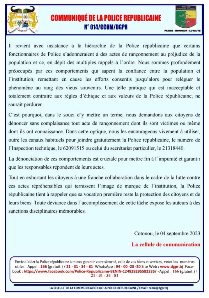 Ainsi, en réponse à cette gangrène qui n’a que trop duré, il en est appelé à une franche collaboration des populations pour la réussite de la mission républicaine de la police, ceci passe par la dénonciation de tout acte de rançonnement dûment constaté et prouvé. Les lignes téléphoniques 62091515 de l’inspection technique de la police et 21318440 du secrétariat particulier sont mises à disposition des populations pour leur permettre de signaler les cas de rançonnement. Il s’agit bien évidemment de contribuer à la fin de l’impunité et l’omerta qui caractérisent ce phénomène et qui lui offre une carapace derrière laquelle il continue de se développer.
