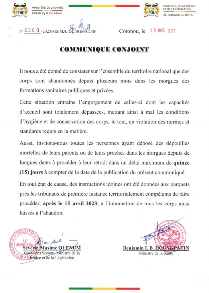 *🇧🇯 BÉNIN Santé et réforme funéraires : le bureau de l’ONG Bénin Diaspora Assistance remercie le gouvernement pour sa décision d’inhumation après le 15 Avril 2023 des corps abandonnés dans les Morgues du Bénin , suite à leurs confiscations pour des raisons de facture d’hospitalisation impayées avant décès 🇧🇯*