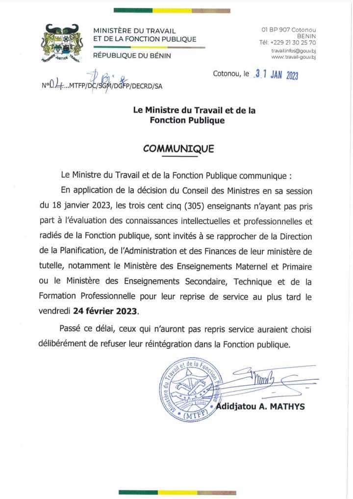 Ils étaient au total 305 enseignants à renoncer à l’évaluation des connaissances intellectuelles et professionnelles initiée par le régime Talon. Face à leur attitude, la décision de leur radiation de la fonction publique avait été prononcée. Plusieurs années après une telle décision, le même régime est revenu le 18 janvier 2023 sur sa décision en prononçant leur réintégration. À cet effet, la fonction publique a rendu public un communiqué les invitant à reprendre le chemin des classes au plus tard le 24 février 2023 contrairement aux rumeurs qui faisaient état de ce qu’ils ne reprendront que pour le compte de l’année scolaire 2023-2024.