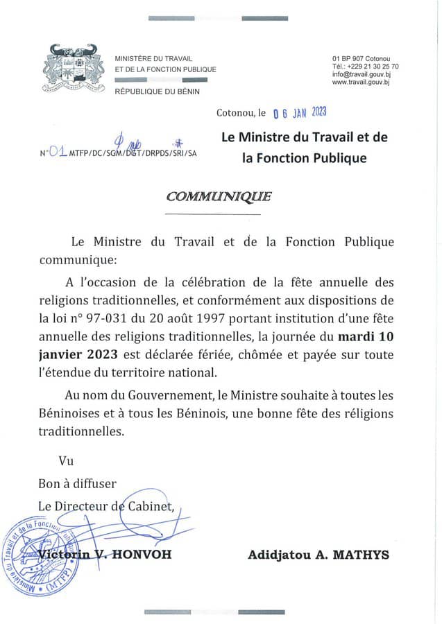 Instaurée en 1993 par l’ancien président Nicéphore Dieudonné Soglo, le 10 janvier devient quelques années plus tard un jour férié. Lire l’intégralité du communiqué