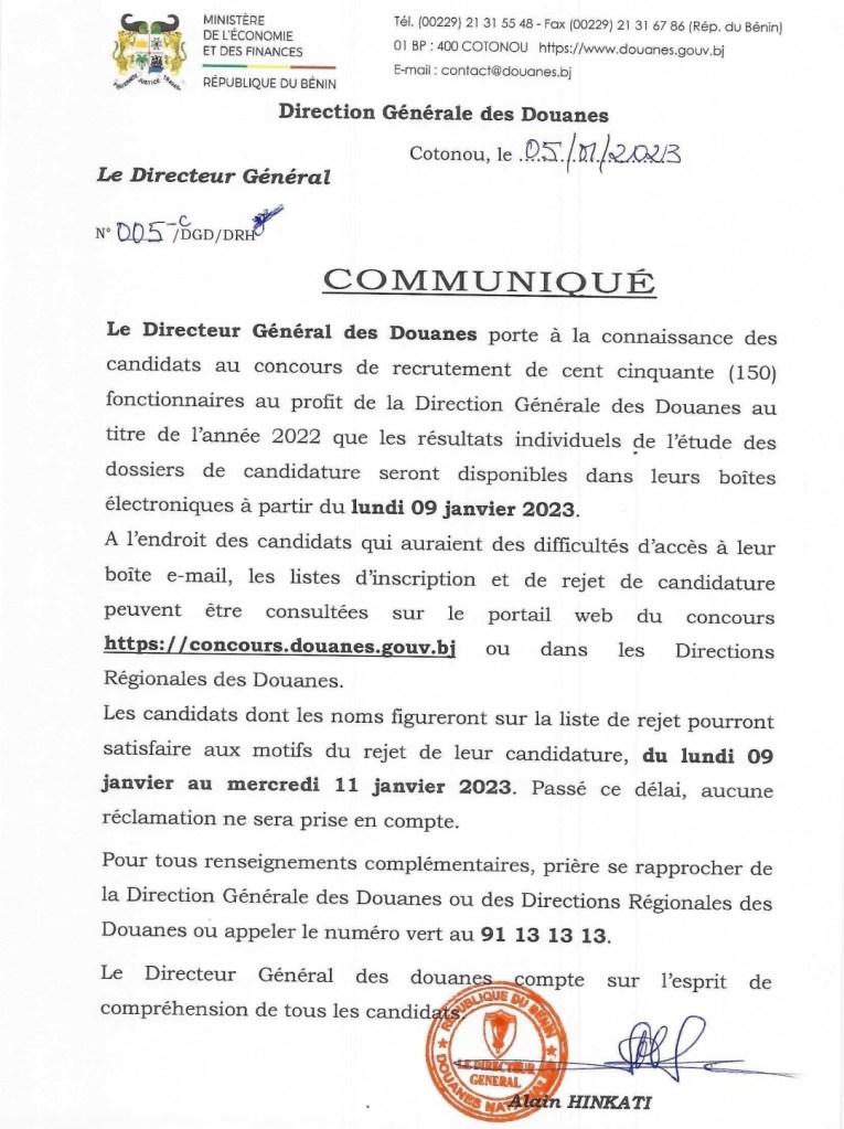 Le Directeur Général des Douanes porte à la connaissance des candidats au concours de recrutement direct à la Douane béninoise de Cent trente (130) élèves Préposés des Douanes, Dix (10) élèves Contrôleurs des Douanes et Dix (10) agents relevant du corps des personnels techniques et administratifs soit un total de Cent cinquante (150) fonctionnaires au profit de la Direction Générale des Douanes au titre de l’année 2022 que les résultats individuels de l’étude des dossiers de candidature seront disponibles dans leurs boîtes électroniques (e-mail) à partir du lundi 09 janvier 2023.